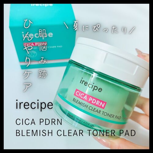 \肌悩み跡ひんやりケア/ 『irecipe CICA PDRN BLEMISH CLEAR TONER PAD』 赤み・毛穴跡・ごわつきに密着ケア。 ひんやりとした使用感で、メイク前のクーリングにもぴったり! ヴィーガン認証の伸びるスマートバンディングパッドが、気になる部分にピタッと…